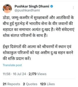 उत्तराखंड में भावुक हुए मुख्यमंत्री पुष्कर सिंह धामी, कैप्टन समेत चार जवानों की शहादत पर किया ट्वीट; ये लिखा……. देहरादून:...