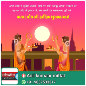 Karva Chauth करवा चौथ एक महिला द्वारा उसके पति की दीर्घायु और सुखमय जीवन की कामना करने और उसकी लम्बी आयु की प्राप्ति के लिए मनाया जाने वाला एक हिन्दू त्योहार है, जो भारत में प्रसिद्ध है। यह त्योहार चौथ तिथि को कार्तिक मास के कृष्ण पक्ष की चतुर्थी तिथि को मनाया जाता है
