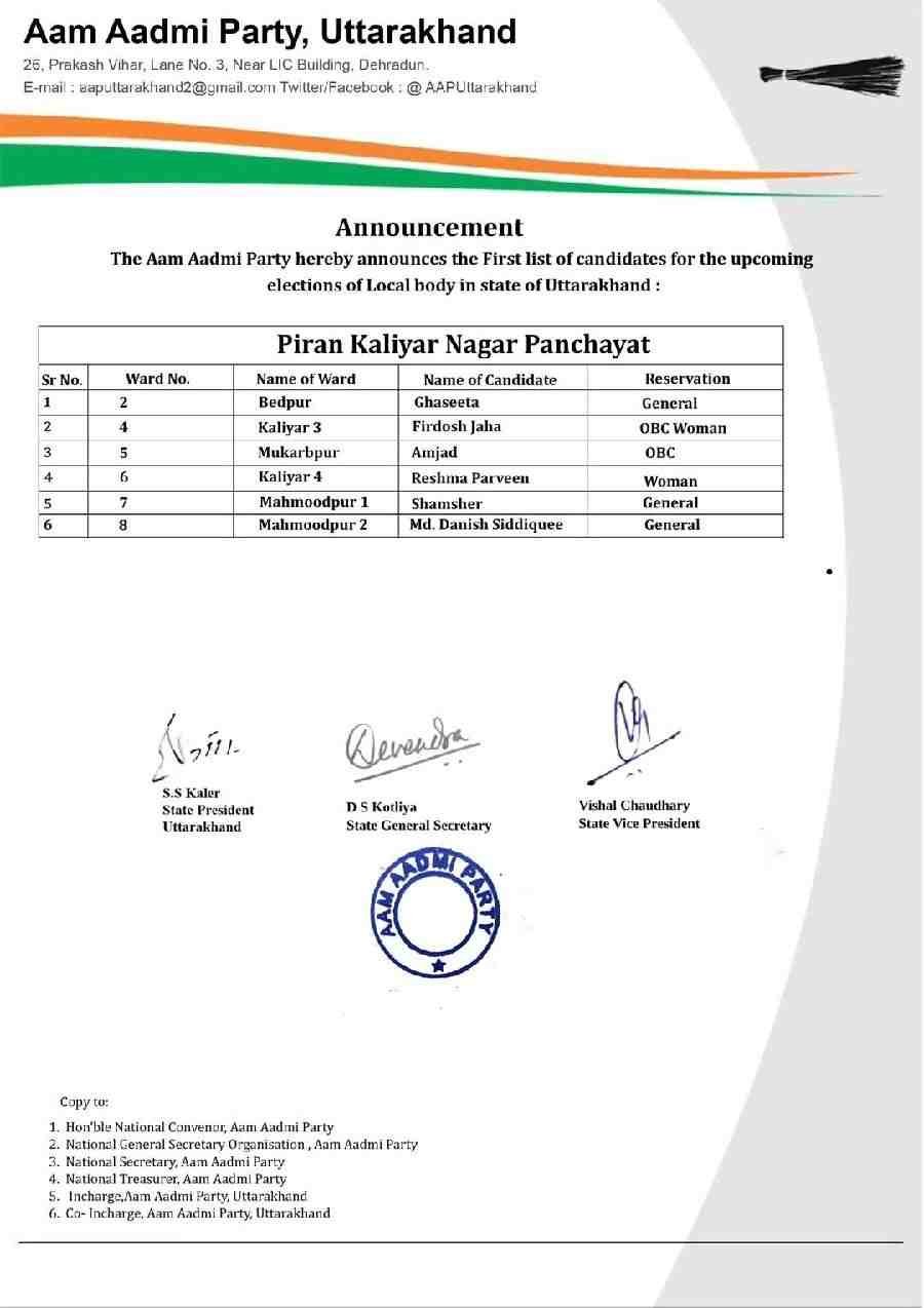 आम आदमी पार्टी ने आज उत्तराखण्ड नगर निकाय चुनावों को लेकर प्रदेश के हरिद्वार,देहरादून,देहरादून महानगर,कीर्तिनगर,डोईवाला, सहित विभिन्न जनपदों के अंतर्गत नगर पालिका परिषद और नगर पंचायत सहित अनेको पार्षद,सभासद और वार्ड मेम्बरों के नामो सहित कुल 35 लोगो की विधिवत रूप से घोषणा कर दी हैं।