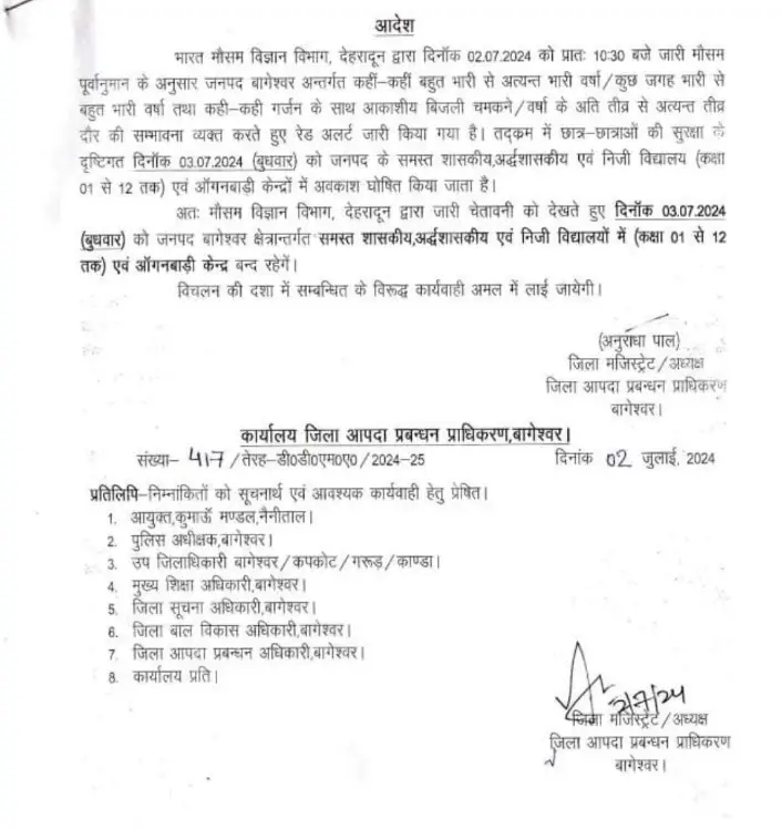 देहरादून: भारत मौसम विज्ञान विभाग, देहरादून द्वारा दिनाँक 02.07.2024 को प्रातः 10:30 बजे जारी मौसम पूर्वानुमान के अनुसार जनपद बागेश्वर अन्तर्गत कहीं-कहीं बहुत भारी से अत्यन्त भारी वर्षा/कुछ जगह भारी से बहुत भारी वर्षा तथा कही कही गर्जन के साथ आकाशीय बिजली चमकने / वर्षा के अति तीव्र से अत्यन्त तीव्र दौर की सम्भावना व्यक्त करते हुए रेड अलर्ट जारी किया गया है। तद्कम में छात्र-छात्राओं की सुरक्षा के दृष्टिगत दिनाँक 03.07.2024 (बुधवार) को जनपद के समस्त शासकीय, अर्द्धशासकीय एवं निजी विद्यालय (कक्षा 01 से 12 तक) एवं ऑगनबाड़ी केन्द्रों में अवकाश घोषित किया जाता है।
