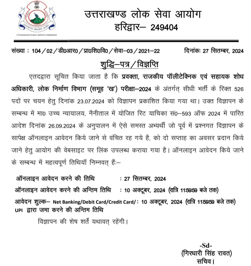 एतदद्वारा सूचित किया जाता है कि प्रवक्ता, राजकीय पॉलीटेक्निक एवं सहायक शोध अधिकारी, लोक निर्माण विभाग (समूह ‘ख’) परीक्षा-2024 के अंतर्गत् सीधी भर्ती के रिक्त 526 पदों पर चयन हेतु दिनांक 23.07.2024 को विज्ञापन प्रकाशित किया गया था। उक्त विज्ञापन के सम्बन्ध में मा० उच्च न्यायालय, नैनीताल में योजित रिट याचिका सं0-593 ऑफ 2024 में पारित आदेश दिनांक 26.09.2024 के अनुपालन में ऐसे समस्त अभ्यर्थी जो पूर्व में प्रश्नगत विज्ञापन के सापेक्ष ऑनलाइन आवेदन किये जाने से वंचित रह गये है, को दो सप्ताह का अवसर प्रदान किये जाने हेतु आयोग की वेबसाइट पर लिंक उपलब्ध कराया गया है। ऑनलाइन आवेदन किये जाने के