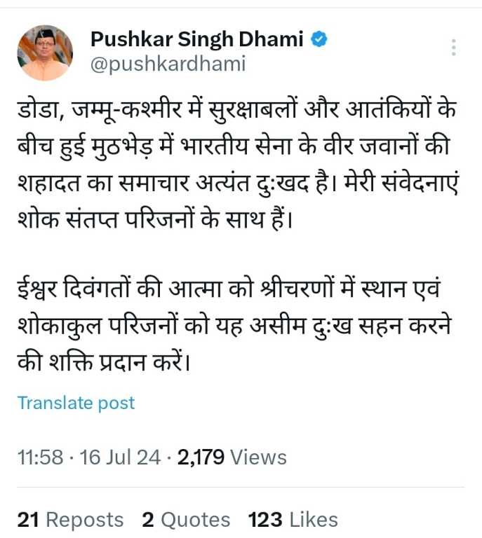 मुख्यमंत्री पुष्कर सिंह धामी ने लिखा कि- जम्मू-कश्मीर के डोडा में सुरक्षाबलों और आतंकियों के बीच हुई मुठभेड़ में भारतीय सेना के वीर जवानों की शहादत का समाचार अत्यंत दुःखद है। मेरी संवेदनाएं शोक संतप्त परिजनों के साथ हैं। ईश्वर दिवंगतों की आत्मा को श्रीचरणों में स्थान एवं शोकाकुल परिजनों को यह असीम दुःख सहन करने की शक्ति प्रदान करें।बता दें कि, जम्मू संभाग के जिला डोडा के देसा वन क्षेत्र में सोमवार को आतंकियों के साथ मुठभेड़ हुई। बताया जा रहा है कि देर रात तक चली मुठभेड़ में कैप्टन सहित चार जवान वीर गति को प्राप्त हो गए।