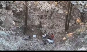 मसूरी। कड़ाके की ठंड और सड़क पर बर्फनुमा पाला एक बार फिर हादसे की वजह बन गई। जॉर्ज एवरेस्ट हाथी पांव रोड पर एक स्कूटी अनियंत्रित होकर गहरी खाई में गिर गई। हादसे में स्कूटी सवार दो लोग मामूली रूप से घायल हो गए। स्थानीय लोगों की तत्परता से दोनों घायलों को खाई से बाहर निकालकर नजदीकी अस्पताल में भर्ती कराया गया, जहां उनका उपचार किया गया।