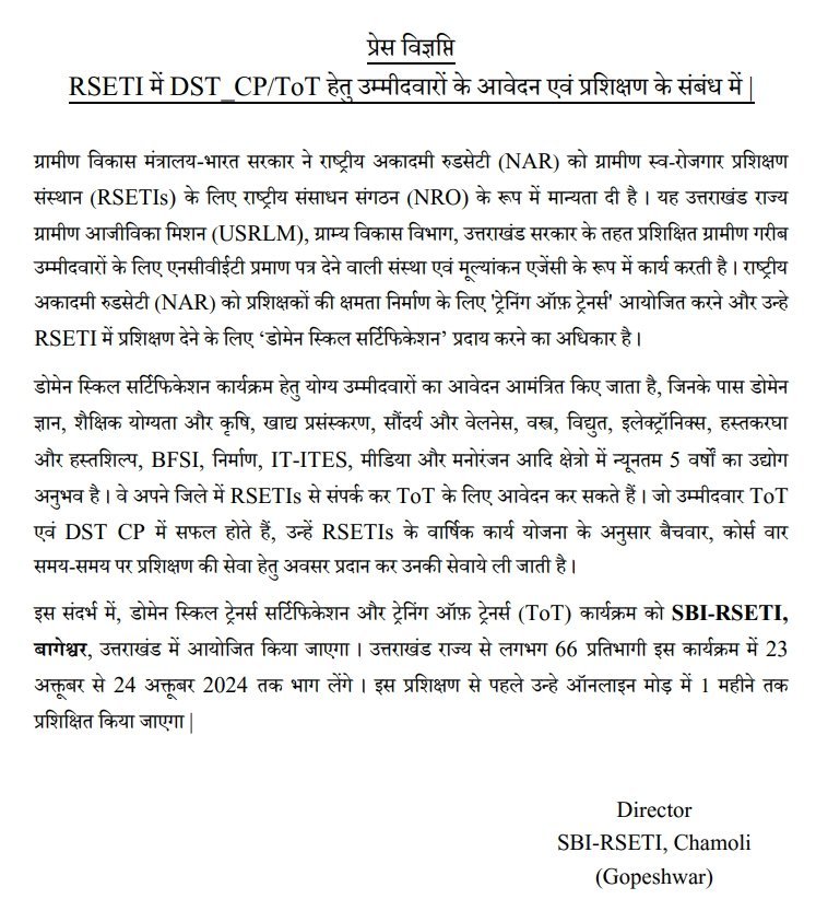 गोपेश्वर (चमोली)। एसबीआई आर सेटी की ओर से प्रशिक्षकों के लिए आवेदन पत्र आमंत्रित किये जा रहे है। इच्छुक अभ्यर्थी आर सेटी गोपेश्वर के कार्यालय से संपर्क कर अधिक जानकारी प्राप्त कर सकते है।
