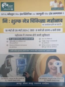 कोटद्वार। हंस फाउंडेशन की संस्थापक माता मंगला जी एवं भोले जी महाराज की प्रेरणा से आगामी 18 से 28 मई तक दस दिवसीय नि: शुल्क नेत्र चिकित्सा महोत्सव का आयोजन किया जा रहा है। यह जानकारी हंस क्लीनिक कोटद्वार के श्री भंडारी ने देते हुए बताया कि दस दिवसीय नि: शुल्क नेत्र चिकित्सा महोत्सव का आयोजन आगामी 18 मई से 28 मई तक कोटद्वार स्थित देवी रोड़ पर हंस क्लीनिक तथा सतपुली स्थित हंस अस्पताल में किया जा रहा है। महोत्सव में नेत्र विशेषज्ञों द्वारा मोतियाबिंद का आपरेशन एवं लैंस प्रत्यारोपण, भेंगापन व तिरछापन का इलाज एवं आपरेशन, बाल नेत्र चिकित्सा, नाखूने, नासूर व पलकबंदी के आपरेशन, पर्दे का उपचार व आपरेशन में हिले हुए पर्दे के आपरेशन किए जाएंगे। इसके अलावा नि: शुल्क परामर्श, आंखों की जांच, दवाईयां एवं चश्मे दिए जाएंगे। उन्होंने कहा कि महोत्सव में आने वाले मरीज अपना आधार कार्ड अथवा अन्य कोई भी पहचान पत्र साथ लेकर आएं।