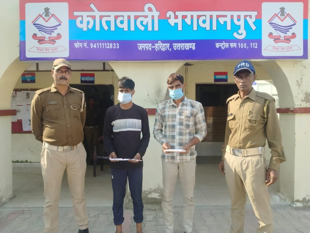 हरिद्वार की थाना भगवानपुर पुलिस ने संदिग्ध अवस्था में घूमने वाले 02 आरोपियों को गिरफ्तार किया है पुलिस को दोनों आरोपियों के कब्जे से अवैध चाकू बरामद किये है आपको बता दे की वरिष्ठ पुलिस अधीक्षक जनपद हरिद्वार द्वारा संदिग्ध व्यक्तियों/ असामाजिक तत्वों पर पूर्णता अंकुश लगाए जाने हेतु निर्देशित किया गया। जिस पर प्रभारी निरीक्षक भगवानपुर द्वारा अधीनस्थ कर्मियों को आवश्यक दिशा निर्देश दिए गए। जिसके अनुपालन में भगवानपुर से पुलिस टीम द्वारा दौराने चैंकिग अलग–अलग स्थानो से आरोपी(1) मोहिन पुत्र इमरान निवासी चौल्ली शबाबुद्दीन थाना भगवानपुर जिला हरिद्वार को छापुर रोड पर आम के बगीचे के पास से एक अवैध चाकू के साथ पकडा गया व आरोपी (2) शाहरुख पुत्र मुर्तजा निवासी ग्राम सिकन्दरपुर भैंसवाल कोतवाली भगवानपुर जनपद हरिद्वार को ग्राम सिकन्दरपुर से ग्राम दौडबसी को जाने वाली रोड से एक अवैध चाकू के साथ पकडा गया।