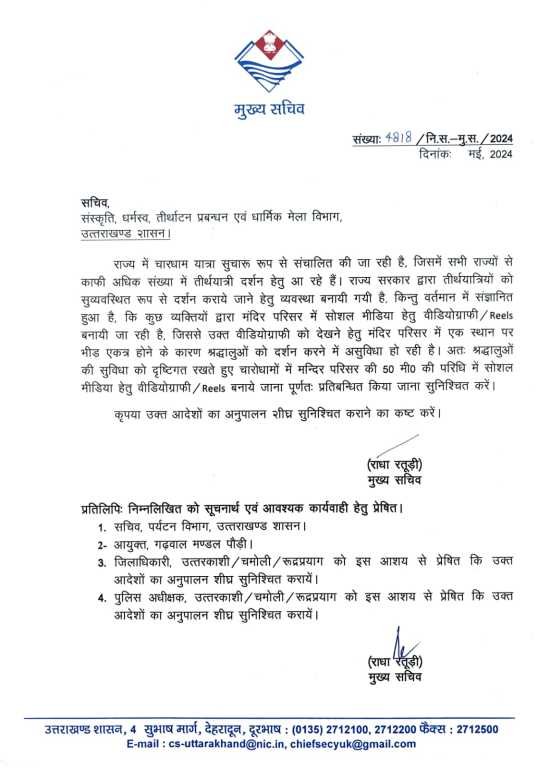 अतः श्रद्धालुओं की सुविधा को दृष्टिगत रखते हुए चारोधामों में मन्दिर परिसर की 50 मी० की परिधि में सोशल मीडिया हेतु वीडियोग्राफी / Reels बनाये जाना पूर्णतः प्रतिबन्धित किया जाना सुनिश्चित करें।