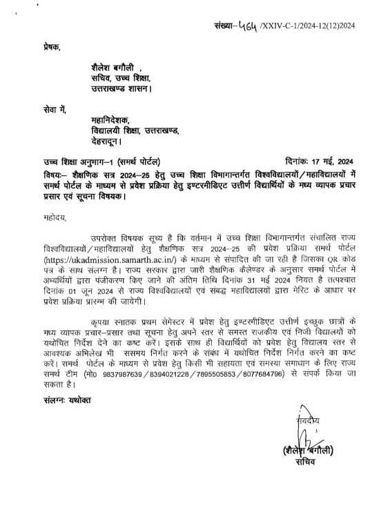विश्वविद्यालयों / महाविद्यालयों हेतु शैक्षणिक सत्र 2024-25 की प्रवेश प्रक्रिया समर्थ पोर्टल (https://ukadmission.samarth.ac.in/) के माध्यम से संपादित की जा रही है जिसका QR कोड पत्र के साथ संलग्न है। राज्य सरकार द्वारा जारी शैक्षणिक कैलेण्डर के अनुसार समर्थ पोर्टल में अभ्यर्थियों द्वारा पंजीकरण किए जाने की अंतिम तिथि दिनांक 31 मई 2024 नियत है तत्पश्चात दिनांक 01 जून 2024 से राज्य विश्वविद्यालयों एवं संबद्ध महाविद्यालयों द्वारा मेरिट के आधार पर प्रवेश प्रक्रिया प्रारम्भ की जायेगी। कृपया स्नातक प्रथम सेमेस्टर में प्रवेश हेतु इण्टरमीडिएट उत्तीर्ण इच्छुक छात्रों के