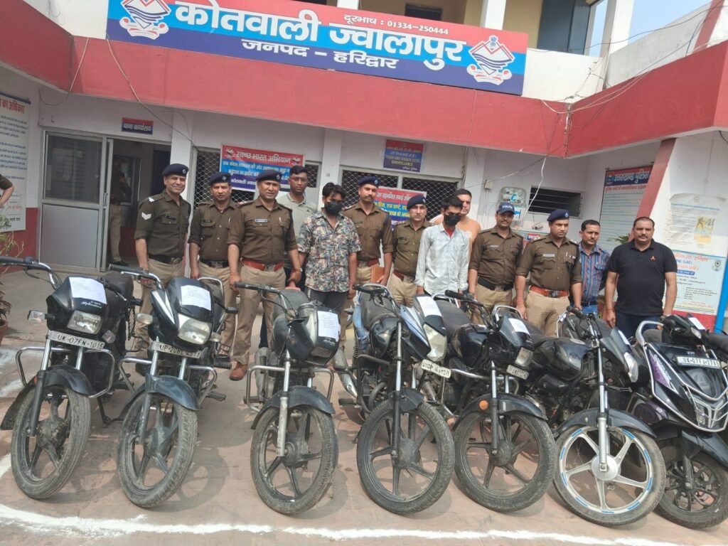 हरिद्वार की कोतवाली ज्वालापुर ने पुलिस का बड़ा एक्शन, अंतरराज्यीय वाहन चोरी गैंग का पर्दाफाश करते हुए मोसिन और गुल्सान की जोड़ी को गिरफ्तार किया है पुलिस ने पकडे गये आरोपियों के कब्ज़े से 10 चोरी के दोपहिया वाहन बरामद किये है प्राप्त जानकारी के अनुसार दिनांक 05/03/2026 को शुभम कुमार पुत्र जहारू सिंह निवासी इमलीखेड़ा थाना पिरान कलियर, हरिद्वार द्वारा सूचना दी गई कि उनकी मोटरसाइकिल HF Deluxe संख्या UK17L-8320 दिनांक 04/03/2026 को महाराजा फर्नीचर, ऊंचा पुल ज्वालापुर के पास से अज्ञात चोर द्वारा चोरी कर ली गई है। इस संबंध में कोतवाली ज्वालापुर पर मुकदमा अपराध संख्या 238/2026 पंजीकृत किया गया।