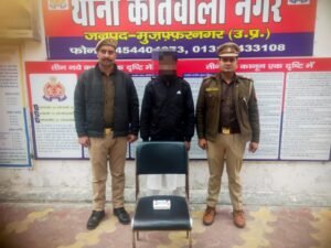 मुज़फ्फरनगर की थाना कोतवाली नगर पुलिस ने सुनार की दुकान से हुई चोरी की घटना का सफल अनावरण करते हुए 1 शातिर चोर अभियुक्त को गिरफ्तार किया है पुलिस ने आरोपी के पास से चोरी की गयी 05 अंगूठी (पीली धातू) की बरामद की है प्राप्त जानकारी के अनुसार- दिनाँक 03.02.2026 को वादी नवीन कुमार शर्मा पुत्र आनन्द कुमार शर्मा निवासी मोती महल थाना कोतवाली नगर मु0नगर के द्वारा लिखित तहरीर देते हुए थाना कोतवाली नगर पुलिस को बताया कि वह दिनाँक 02.02.26 को सर्राफा बाजार मुजफ्फरनगर स्थित अपनी दुकान पर बैठे थे इसी दौरान एक अज्ञात व्यक्ति के द्वारा 05 अदद पीली धातू की अंगूठी को चोरी करने की घटना कारित की गयी है। इस सम्बन्ध में थाना कोतवाली नगर पर मु0अ0स0- 0048/2026 धारा 305 क बीएनएस पंजीकृत किया गया । घटना के शीघ्र व सफल अनावरण हेतु थाना कोतवाली नगर स्तर पर टीमों का गठन किया गया। गठित टीमों द्वारा आज दिनांक 09.02.2026 को उपरोक्त अभियोग का सफल अनावरण करते हुए चरथावल रोड से न्याजुपुरा जाने वाले रास्ते से 01 शातिर अभियुक्त को गिरफ्तार किया गया। अभियुक्त के कब्जे से चोरी की गयी 05 अंगूठी पीली धातु बरामद की गयी। अभियुक्त की गिरफ्तारी व बरामदगी के सम्बन्ध में थाना कोतवाली नगर पुलिस द्वारा अग्रिम विधिक कार्यवाही की जा रही है।