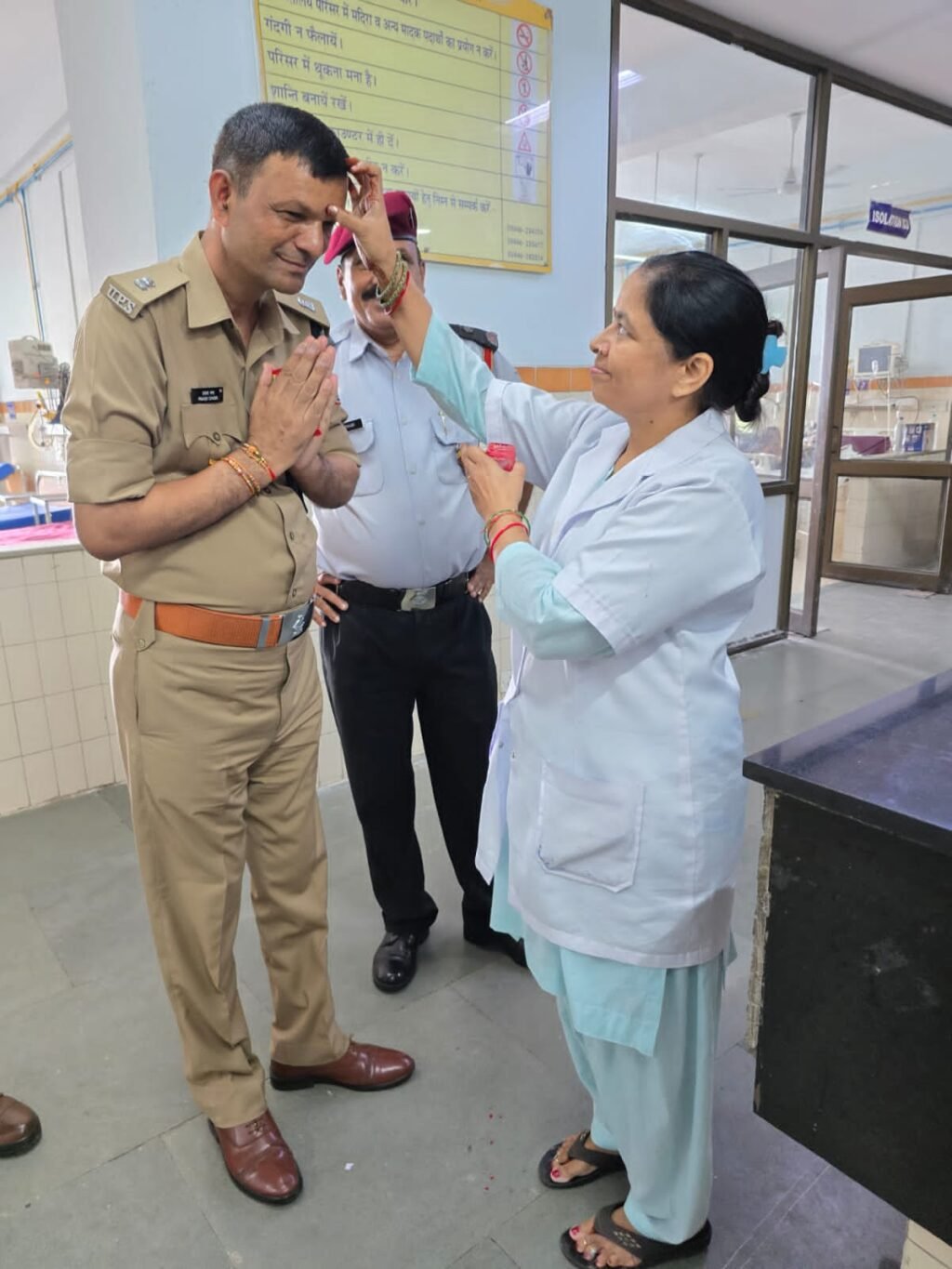 आज पूरे देश में बहन-भाई के अटूट प्रेम, स्नेह व विश्वास का प्रतीक पावन पर्व *रक्षाबंधन* मनाया जा रहा है। जिसके सकुशल आयोजन के लिए प्रह्लाद नारायण मीणा, एसएसपी नैनीताल* द्वारा जिलेभर में भारी मात्रा में पुलिस कर्मियो को तैनात कर सुदृढ़ सुरक्षा व्यवस्था के पुख्ता इंतजाम किए गए हैं। सभी अधिकारियों/कर्मियों द्वारा हर स्तर पर सतर्कता बरती जा रही है। आज रक्षाबंधन के पावन पर्व को मनाने नैनीताल पुलिस के *एसपी सिटी हल्द्वानी प्रकाश चंद्र तथा सीओ हल्द्वानी नितिन लोहनी* पुलिस बल समेत हल्द्वानी के *डॉ सुशीला तिवारी अस्पताल* पहुंचे। वहां सभी पुलिस कर्मियों ने अस्पताल में ड्यूटी पर तैनात डॉक्टर तथा नर्सों को रक्षाबंधन की बधाई दी। साथ ही वहां मौजूद डॉक्टर बहनों ने पुलिस कर्मियों को राखी बांधी। पुलिस द्वारा बहनों को उपहार भेंट कर सुरक्षा का भरोसा दिया और महिला सुरक्षा के लिए संकल्पबद्ध होकर कार्य करने के लिए अस्वस्त किया। इसके अतिरिक्त हल्द्वानी शहर में जगह–जगह पर तैनात महिला पुलिस कर्मियो के साथ भी रक्षाबंधन का त्योहार मानकर उनसे रखी बंधवाकर उपहार भेंट किए।