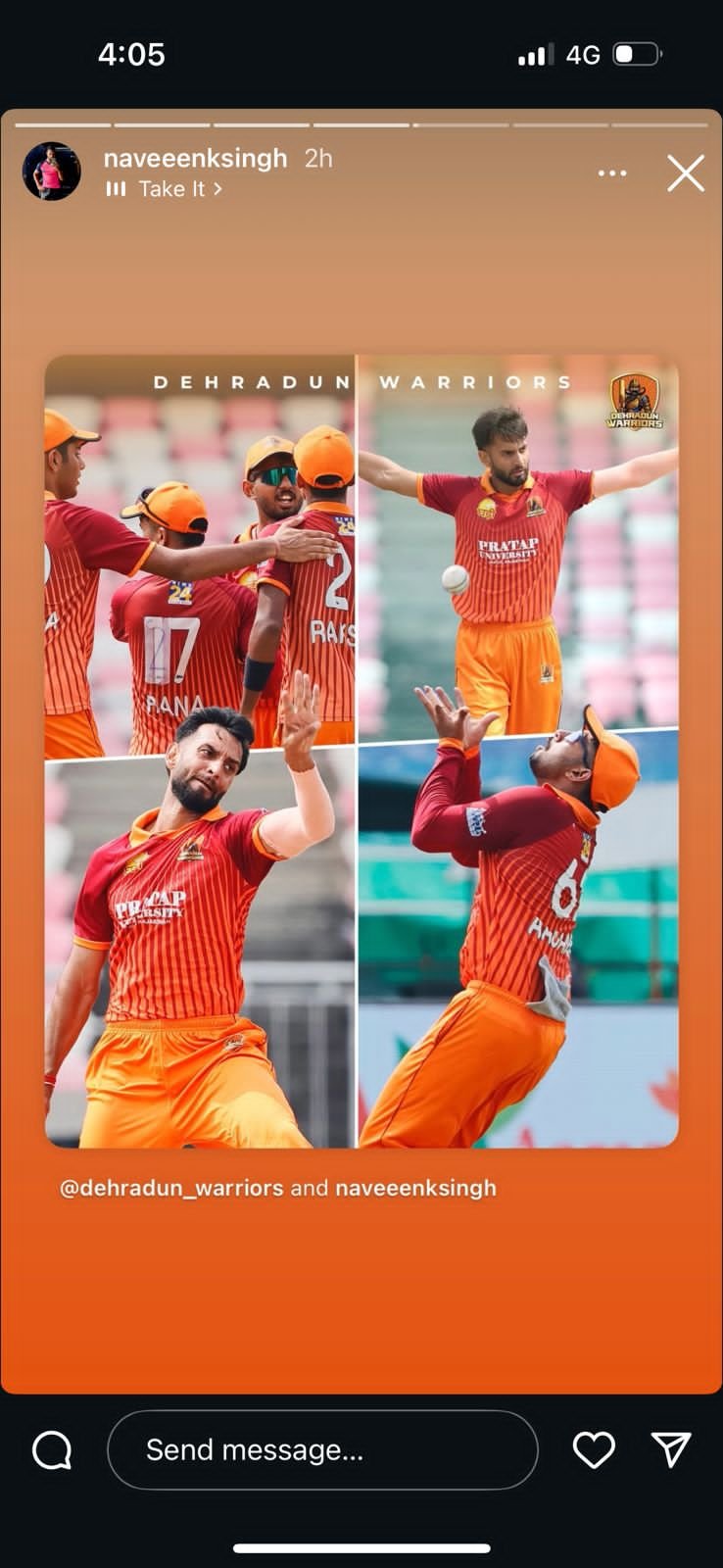 नवीन कुमार सिंह अपने पहले मैच में देहरादून वॉरियर्स (UPL)2025 की और से खेलते हुए 04 ओवर में 22 रन देकर 02 विकेट झटके नवीन कुमार का पिछले UPL 2024 में भी अच्छा प्रदर्शन किया गया था ,जिसके चलते इस बार देहरादून वारियर्स की टीम के द्वारा UPL में चयन किया गया है । नवीन नेट बॉलर के तौर पर IPL में राजस्थान रॉयल्स व लखनऊ सुपरजायंट्स की टीम में नेट बोलिंग कर चुके हैं।