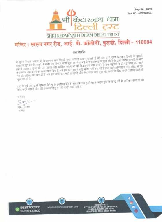इधर अब, श्री केदारनाथ धाम दिल्ली ट्रस्ट की अध्यक्ष सुमन मित्तल ने अवगत कराया है कि पूर्व में सभी ट्रस्टी मिलकर दिल्ली के बुराड़ी, बख्तावरपुर रोड हिरणकी में मंदिर का निर्माण कार्य शुरू करने जा रहे थे, लेकिन उत्तराखण्ड के कुछ लोगों के द्वारा विरोध/आपत्ति के बाद यह अहसास हुआ की जन मानुष और धार्मिक भावनाओं को केदारनाथ धाम बनाने से ठेस पहुँचती है तो इसके मद्देनजर दिल्ली में केदारनाथ धाम बनाने का कार्य त्याग दिया गया है और अब इस नाम से कोई मंदिर नहीं बनाने का निर्णय लिया गया है। इसके लिए ऑनलाइन / QR कोड से दान लेने की प्रक्रिया भी बंद कर दी है और अब कोई दान नहीं लिया जा रहा। उन्होंने कहा कि केदारनाथ धाम ट्रस्ट बंद करने के लिए हमने प्रक्रिया पहले ही शुरू कर दी है।