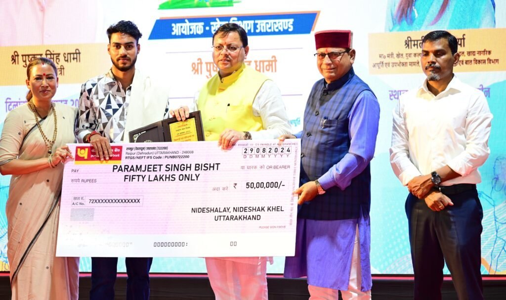 देहरादून । मुख्यमंत्री पुष्कर सिंह धामी ने गुरुवार को बहुउद्देशीय क्रीडा भवन, परेड ग्राउंड देहरादून में राष्ट्रीय खेल दिवस के अवसर पर आयोजित कार्यक्रम में सभी को खेल दिवस की शुभकामना दी तथा हॉकी के जादूगर के चित्र पर माल्यार्पण कर उन्हें श्रद्धांजलि अर्पित की। इस अवसर पर मुख्यमंत्री ने पेरिस ओलंपिक 2024 में प्रतिभाग करने वाले उत्तराखंड के 4 खिलाड़ियों ( लक्ष्य सेन, परमजीत सिंह, सूरज पंवार, अंकिता ध्यानी ) को 50 – 50 लाख की धनराशि के चेक प्रदान किये।