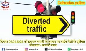2. अतः देहरादून की सभ्रान्त जनता से अपील है कि उक्त बाईक रैली मार्गो का प्रयोग न करते हुए अन्य वैकल्पिक व डायवर्जन मार्गो का प्रयोग करें ,यथासम्भव दूपहिया वाहनों का प्रयेाग कर देहरादून यातायात पुलिस को अपना अमूल्य सहयोग प्रदान करे ।