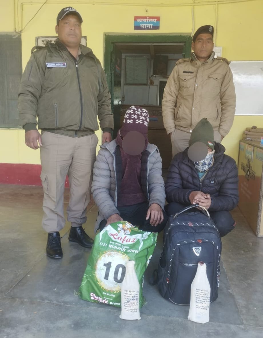 अवैध शराब तस्करी के विरुद्ध चलाये जा रहे अभियान के क्रम में जनपद रुद्रप्रयाग पुलिस की थाना ऊखीमठ पुलिस द्वारा थाना प्रभारी ऊखीमठ मुकेश चौहान के नेतृत्व में थाना ऊखीमठ क्षेत्रान्तर्गत चेकिंग के दौरान 02 नेपालियों के कब्जे से 28 बोतल शराब की बरामदगी की गई है। जिनके विरुद्ध थाना ऊखीमठ पर आबकारी अधिनियम की सुसंगत धाराओं में अभियोग पंजीकृत किया गया है।