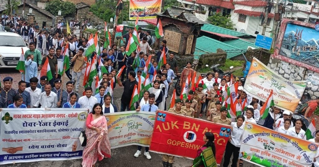 चमोली जिला मुख्यालय गोपेश्वर के छात्रों की ओर से तिरंगा रैली निकाली गई रैली को को हरी झंडी दिखाकर रवाना करते हुए महाविद्यालय के प्रभारी प्राचार्य डॉ. मनीष डंगवाल ने कहा कि तिरंगा यात्रा का मुख्य उद्देश्य हर देशवासी के मन में राष्ट्रप्रेम की भावना जागृत करना है। कार्यक्रम समारोहक डीएस नेगी के नेतृत्व में छात्रों की रैली महाविद्यालय परिसर से पुलिस लाइन, मुख्य बाजार होते हुए गोपीनाथ मंदिर तक पहुंची। रैली के दौरान छात्र छात्राओं ने देशभक्ति से परिपूर्ण नारों एवं गीतों से आमजन को तिरंगे के सम्मान के प्रति जागरूक किया। रैली समापन के पश्चात एनएसएस, एनसीसी एवं रोवर्स रेंजर्स के स्वयंसेवियों ने महाविद्यालय परिसर में स्वच्छता अभियान चलाया। इस अवसर पर डॉ. जेएस नेगी, डॉ. भावना मेहरा, डॉ. पीएल शाह, डॉ. वंदना लोहनी, डॉ. संध्या गैरोला, डॉ. प्रेमलता, डॉ. रंजू बिष्ट, डॉ. सुनील भंडारी, डॉ. महेंद्र प्रसाद, डॉ. घनश्याम, डॉ. राजकुमार कश्यप, डॉ. चंद्रेश, डॉ. रविशंकर कुनियाल, डॉ. नाभेंद्र गुसाईं आदि उपस्थित रहे।