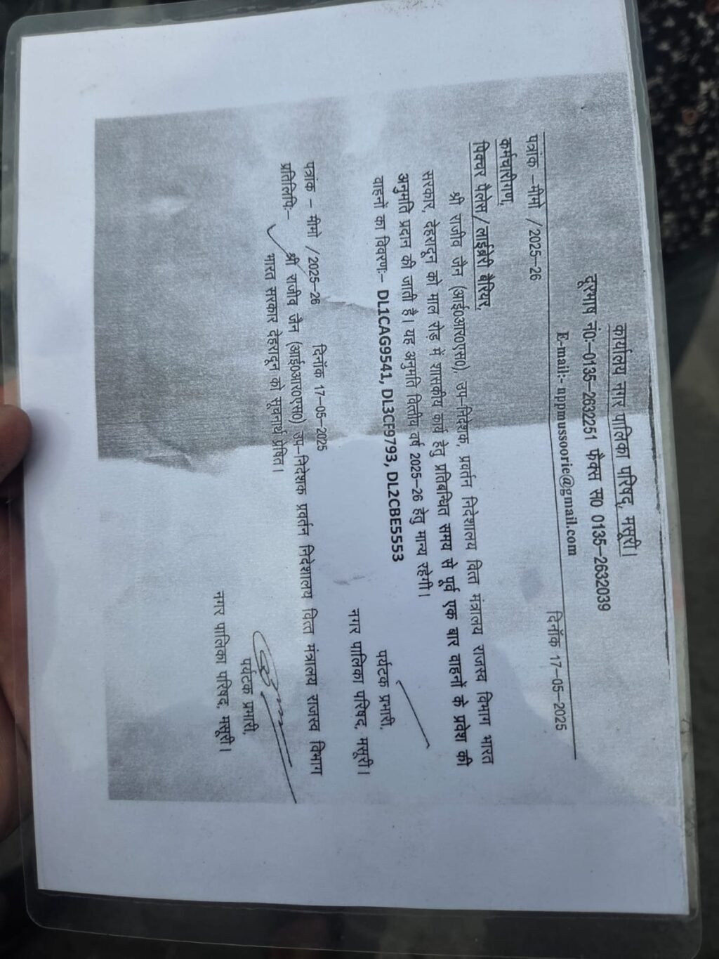 जानकारी के अनुसार वित्तीय वर्ष 2025-26 के लिए दिल्ली नंबर की तीन गाड़ियों को पिक्चर पैलेस और लाइब्रेरी बैरियर से प्रतिबंधित समय में प्रवेश की अनुमति दी गई थी। आरोप है कि इन वाहनों से क्लब महिंद्रा के पास स्थित “समर क्लाउड होम स्टे” से पर्यटकों को माल रोड तक लाया-ले जाया जा रहा है।