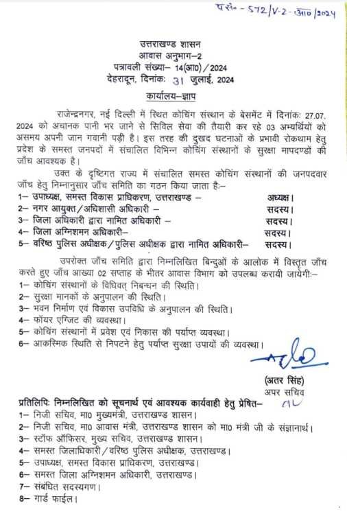 देहरादून: राजेन्द्रनगर, नई दिल्ली में स्थित कोचिंग संस्थान के बेसमेंट में दिनांक: 27.07. 2024 को अचानक पानी भर जाने से सिविल सेवा की तैयारी कर रहे 03 अभ्यर्थियों को असमय अपनी जान गवानी पड़ी है। इस तरह की दुखद घटनाओं के प्रभावी रोकथाम हेतु प्रदेश के समस्त जनपदों में संचालित विभिन्न कोचिंग संस्थानों के सुरक्षा मापदण्डों की जाँच आवश्यक है।