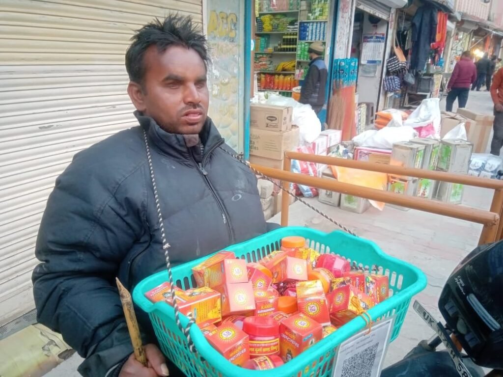 गोपेश्वर (चमोली)। श्री बदरीनाथ धाम में दोनों आंखों से दिब्यांग जिला दुमका झारखंड निवासी 35 वर्षीय कृष्णपाल वर्ष 2007 से श्री बदरीनाथ धाम में फेरी लगाकर, डलिया गले में डालकर भगवान श्री बदरीनाथ धाम का प्रसाद, पूजा सामग्री, सिंदूर आदि बेचते है इसी से बदरीनाथ में अकेले रहकर अपना जीवन यापन करते है। वह कहते है कि वह जन्मांध है इसका उन्हें कुछ भी मलाल नही है। वह मौसम का अनुमान बता देते है तो जिस व्यक्ति की आवाज तथा नाम एक बार सुन लेते है दूर से आवाज से पहचान जाते है।