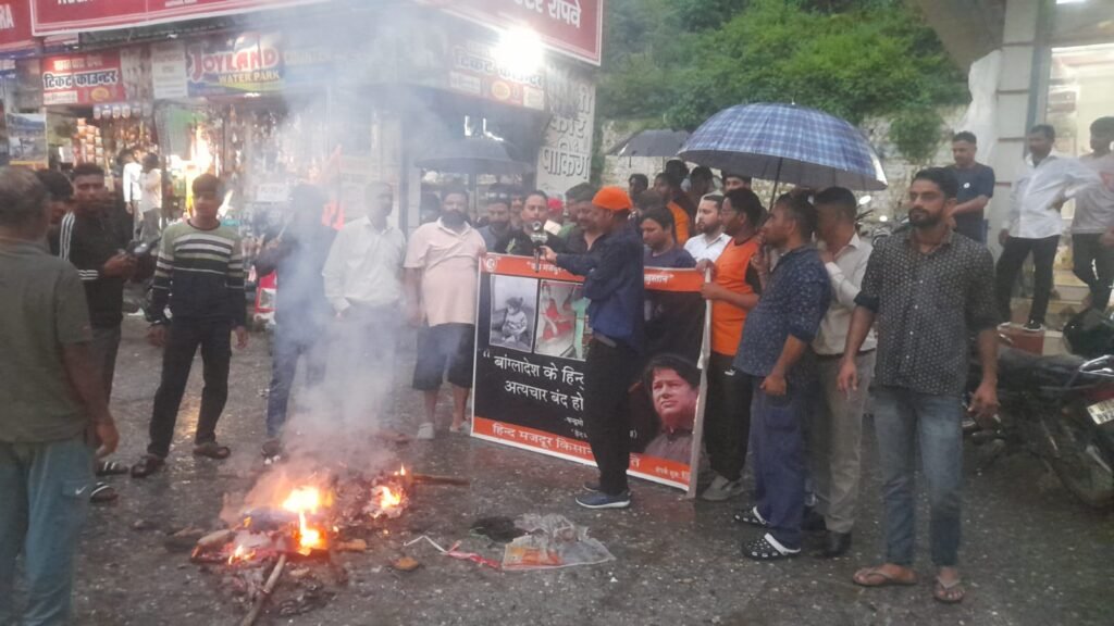 बंग्लादेश मे सत्ता परिवर्तन के बाद अल्पसंख्यक हिन्दओ पर लगातार हो रहे अत्याचार की आग अब हिन्दुस्तान के कोने कोने मे सुलगने लगी है इसी कडी मे आज विश्व प्रसिद्ध पर्यटन स्थल सहस्त्रधारा मे स्थानीय लोगो ने सहस्त्रधारा व्यापार मंडल के साथ मिलकर बंग्लादेश सरकार का पुतला दहन कर अपना विरोध प्रकट किया और विश्व के हिंदू एक हैं” के उद्घोष के साथ बांग्लादेश के हिन्दू समाज पर अत्याचार, बांग्लादेश के प्रताड़ित हिंदू जो की बांग्लादेश की सैन्य समर्थित सरकार द्वारा पोषित कट्टरपंथियों द्वारा जघन्य अत्याचारो को झेल रहे है को लेकर विश्व के हिंदू एक हैं” के उद्घोष के साथ बांग्लादेश के प्रताड़ित हिंदू जो हत्याकांड,बलात्कार,जान माल की हानि जैसे बर्बरता पूर्ण अपराधिक कार्यवाही पिछले एक सप्ताह से झेल रहे है। उन बांग्लादेश के हिंदुओं के पक्ष में आवाज उठाने के लिए ,उनके प्रति संवेदना व्यक्त करने के लिए सहस्त्रधारा व्यापार मंडल ने इसका आयोजन किया जिसमे व्यापार मंडल अनूपपायल मनजीत सिंह जवाडी राकेश जवाडी सतीश प्रवीन चंदेल कृपाल सिंह जवाडी पूर्व प्रधान अनिल नेगी मुकेश अग्रवाल नारायण सिंह राणा सुरत सिह रमेश जवाडी अंकित जवाडी ग्राम प्रधान यशपाल सुनीता सहित दर्जनो व्यापारियो और स्थानीय लोगो ने भाग लिया।